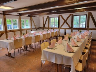 Vores hyggelige caféhus er et gammelt bindingsværkshus med stråtag – fyldt med charme og atmosfære. Her finder du et selskabslokale med plads til op til 40 personer samt et veludstyret køkken, så du kan holde alt fra familiefester til hyggelige sammenkomster.