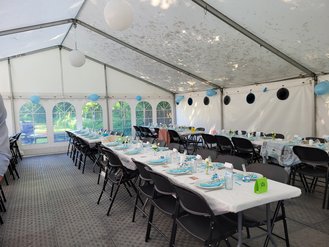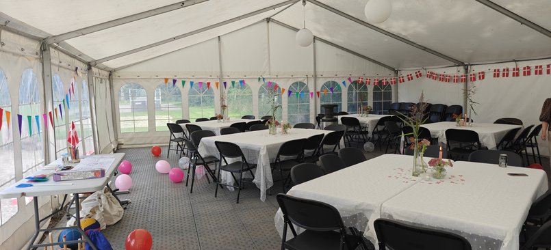 Så kan du leje vores hyggelige festtelt på 12 x 8 meter med fast gulv, borde og stole til op til 80 personer.